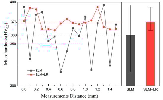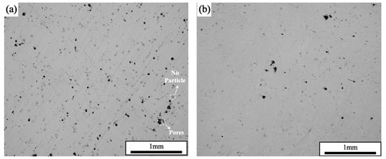 Under the parameters of a laser power of 200 W and a scanning speed of 600 mm/s, the densities of the samples prepared by single scanning were 99.33%, and the densities of the samples prepared by two interlayer laser remelting scans were 99.96%. The cross-sectional morphology of the formed samples is shown in Figure 5, which shows that the samples that adopted the SLM + LR process had fewer pores, which was the main reason for the increase in densities. It was observed that the sample with the SLM + LR process had less porosity, which was the main reason for the increase in density, and the second phase unfused Nb particles interspersed within it were significantly reduced.