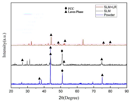 Figure 6 shows the XRD diffraction peaks of the raw material powder prepared by the simple mechanical mixing method and the two process forming samples. It was observed that the diffraction peaks of the raw material powder prepared by the mechanical mixing method were only a simple superposition of the CoCrFeNi pre-alloy and the Nb monomers, suggesting that it did not undergo the mechanical alloying in the ball milling process. In specimens formed using SLM, the diffraction peaks of the Laves phase with a hexagonal structure began to appear on the side of the FCC (111) peak. This resulted in the FCC phase losing its growth selective orientation, and the (111) peak decreased. In contrast, the XRD diffraction peaks of the specimens prepared by selective laser melting (SLM) broadened significantly and shifted to the left as a whole, in comparison with the specimens prepared by the traditional casting method []. Furthermore, the analysis of the Bragg’s formula revealed that when the wavelength of the X-rays was maintained, the diffraction angle θ diminished, resulting in an expansion of the crystal plane spacing d. This phenomenon can be reasonably interpreted as an indication of a considerable number of lattice aberrations in the specimens. Moreover, the equations derived by Woo and Jiang et al. [] based on the Williamson–Hall (WH) theory indicated that a significant amount of residual stresses existed within the specimen due to the nature of the zone-selective laser melting process itself. The half-height width of the diffraction peaks of the specimens shaped by the SLM + LR process was narrowed, the FCC (111) peak was further reduced, and the diffraction peaks did not shift. These observations indicated that the use of the LR process was able to reduce the residual stresses and lattice distortions in the specimens.