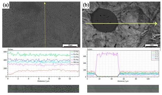 Figure 7 shows the EDS line scan results of some areas in the formed sample. Two types of organizational structures were observed, the first being spherical second-phase particles, and the second being columnar crystals diffused outward with the FCC matrix as the center. According to the EDS results, the second phase particles were unfused Nb particles. These observations were consistent with the study of He et al. []. As shown in Figure 7, the dissociated eutectic, eutectic, and hypereutectic tissues were distributed in different degrees. Around the Nb particles, per-eutectic organization dominated by the bright white coarse Laves phase was observed. Away from the Nb particles, the dissociated eutectic organization dominated by the dark gray FCC matrix was presented. The lamellar eutectic organization was observed at the transition position between the two. The analysis suggests two different precipitation mechanisms for the Laves phase within the tissue, depending on whether the Nb particles were completely dissolved in the matrix. It is important to note that there were different degrees of unfused Nb particles in the sample tissue, and the investigation in this section refers specifically to the second-phase Nb particles that fused with the matrix to some extent.