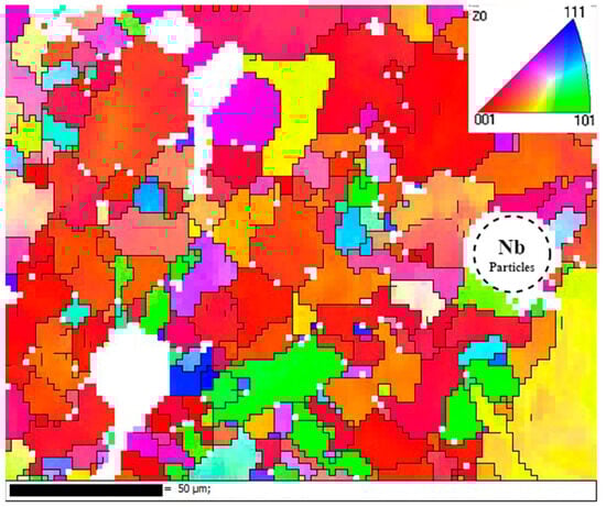 Figure 9 shows the grain orientation of the formed specimen. It can be seen that the fine grains were mainly concentrated in the vicinity of unfused Nb particles, and the main grain orientation was in the (001) direction. This was because the radius of the Nb atoms was much larger than that of the elements in the matrix, which produced a strong lattice distortion effect and thus induced grain refinement.