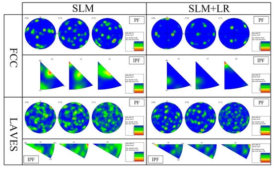 Figure 10 shows the IPF plots of the samples formed by the SLM process versus the SLM + LR process. It can be seen that the SLM-formed specimens showed more weave in the {100} direction. This was mainly due to the fact that more Nb entered the matrix during the remelting process, causing the concentration of Nb elements in the local area to reach the eutectic point and, thus, eutectic reaction occurred.
