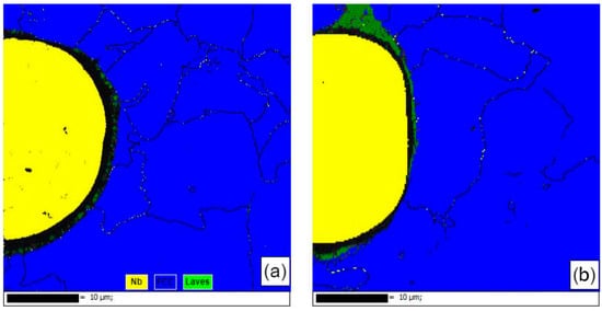 Figure 11 shows the EBSD phase compositions near the second-phase particles of the samples formed using single scan forming and those formed using the remelting process. The second-phase Nb particles of the single-scan formed sample were well spherical and subcircular. They did not melt during the forming process but were wrapped by the molten liquid phase of the matrix to form inclusions. In this process, the second phase Nb particles were only affected by the thermal diffusion of Nb atoms into the matrix, and the zero-resolution points near the Nb particles were Laves phases that were not recognized by the database due to severe lattice distortions, while the zero-resolution points inside the Nb particles were pores created by the Kirkendall effect [] in the thermal diffusion. This was used to analyze the residual stresses in the vicinity of the Nb particles. Comparing the samples formed by the remelting process, it was seen that the sphericity of the Nb particles decreased, the whole was ellipsoidal and was partially melted during the forming process, the interior of the Nb particles was dense, and the percentage of the surrounding zero-resolution points decreased. It was observed that there was no obvious lattice aberration in the transition region of the Nb particles to the substrate in the Laves phase, the diffusion layer became thicker, and the second phase of the Nb particles was more tightly bonded to the substrate. Meanwhile, according to the EBSD results, it was also seen that the stresses were mainly concentrated in the vicinity of the second-phase Nb particles, which was reflected by the zero-resolution points caused by lattice distortion near the second-phase Nb particles. It was analyzed that the stress in this region was mainly due to the inconsistency of the composition of the second-phase Nb particles and the matrix, which had a large difference in the coefficient of thermal expansion. The surface temperature of the sample was higher in the forming process, and the melted matrix was wrapped with the second-phase Nb particles. The shrinkage rate of the two was inconsistent with the solidification of the forming layer after cooling, and the diffusion of the elements occurred under the influence of the heat and the concentration gradient (a common effect of the solidification shrinkage and the Kirkendall effect). The solid phase interface between the two had a large stress residue under the joint action of the Kirkendall effect and solidification contraction. The stresses generated by the larger number of second-phase Nb particles were difficult to eliminate by optimizing the process parameters and therefore manifested as thermal cracking defects on a macroscopic scale. The above analysis shows that the remelting process can effectively promote the reduction of the second-phase Nb particles, promote the increase of their content in the matrix, and effectively release the stress near the second-phase Nb particles.