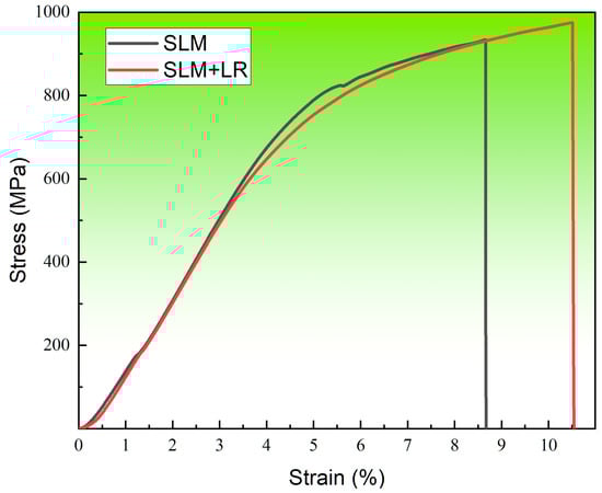 Figure 13 shows the room temperature tensile curve of the forming sample under the two processes. The selected laser melting process parameters were consistent, with a laser power of 200 W and a scanning speed of 600 mm/s. Single scan forming had a tensile strength of 934 MPa and an elongation of 8.66%. The laser remelting process had a tensile strength of 974 MPa and an elongation of 10.51%. It was seen that the alloy samples with the remelting process had higher strength than the single scanning samples, and the plasticity was also improved. On the one hand, it was because the remelting process reduced the structural defects in the forming samples so that the matrix densification rose, and the combination was more compact. On the other hand, the remelting process increased the number of Nb atoms solidly dissolved into the matrix during the forming process, which promoted dissociated eutectic reactions in the matrix, reduced the number of unfused Nb particles in the second phase, and generated more diffuse Laves phases.