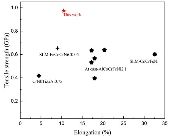 Figure 14 [,,,,,,,] shows a comparison of the properties of CoCrFeNiNb0.25 alloy prepared by mechanical powder mixing and the SLM + LR process with other reported HEA alloys. It was seen that the tensile strength significantly increased after strengthening by the Nb element, but the plasticity significantly reduced compared with the CoCrFeNi matrix alloy; nevertheless, the strengthening effect of the Nb element was still better than that of the C element.