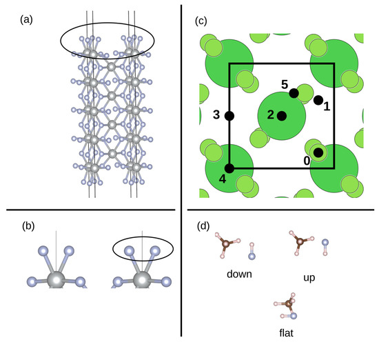 Six different high symmetry positions for the adsorption of CH4 were identified on the surface (see Figure 1c). Site 0 can be classified as on top of the fluorine atom, sites 1, 2, 3, and 4 as the bridge, and site 5 as hollow. For the adsorption of only CH4, the molecule was placed at 1.5, 1.7 and 2.0 Å away from the surface (the distance between the topmost fluorine of the surface and the bottommost atom of the adsorbate), respectively, on each of these positions. For the co-adsorption with the HF, the combinations of all possible positions were made. This resulted in 30 different starting structures. Furthermore, three different orientations of HF were considered (see Figure 1d): F atom pointing towards the surface (labeled as down), F atom pointing away from the surface (labeled as up) and HF molecule being parallel to the surface (flat). For the co-adsorption, the molecules were placed 1.7 Å from the surface. The starting configurations are labeled with numbers, for example, 0_1 represents methane adsorbed on position 0 and HF adsorbed on position 1. In all cases, the molecules were adsorbed on both the top and the bottom side of the surface. In the case of adsorbed CH4, the whole slab model was allowed to relax. For the co-adsorption studies only for the case of down orientation of HF the whole slab was allowed to relax. Since we found that the inner layers of the slab remained unchanged and in light of computational effort, only the three top- and bottommost layers were allowed to relax for the flat and up orientations of HF.