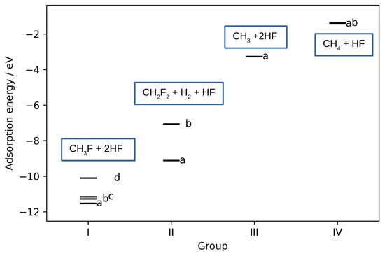 Adsorption energies of the most stable structures obtained after co-adsorption of CH4 and HF. Structures are divided into 4 groups based on their geometric similarities. Each group is further subdivided into subgroups denoted by letters. The main outcome for each of the group is written in the blue box.