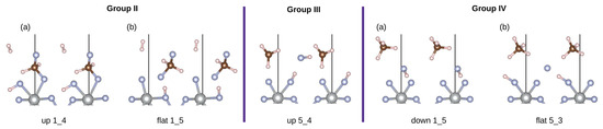 Structures in groups II, III and IV, respectively. Subgroups are denoted with letters. The initial orientation for each structure is written below. Ni atoms are represented in gray, F atoms in blue, C atoms in brown and H atoms in white color.