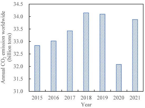 Global CO2 emissions from 2015 to 2021 (million tons) [19,20].