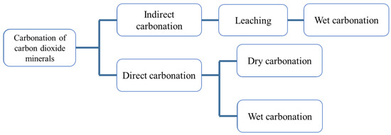 Indirect carbonation initially extracts certain metal elements from steel slag using extraction solvents and then injects carbon dioxide gas into the aqueous solution to form carbonate precipitates. Taking cement and concrete as an example, acidic media is used to recover Ca2+ ions, which are released from the hydrolysis of clinker (e.g., (Ca(OH)2) or from the Ca-O-Si network of hydration products. The leached Ca2+ caGition can react with the CO32− anion, which is derived from the dissolve of CO2 in the liquid to form calcium carbonate. Due to the low solubility of calcium carbonate, it is prone to precipitate, and consequently, carbonate production was developed. The precipitation obtained by this method showed certain economic value, but the process was too complicated, and the additional chemical solvent undoubtedly increased the cost of treatment [55,56].