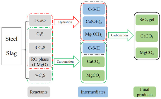 Compared with direct dry carbonation, direct wet carbonation is a complex three-phase reaction process, but it can achieve high CO2 sequestration at room temperature under atmospheric pressure. This reaction process mainly reflects the carbonation of calcium (magnesium) silicate in solution. The components are involved in the reaction between CO2 and hydration products of mineral phases in steel slag, including the hydration of free-CaO, free-MgO, C3S, and β-C2S. Initially, CaO and MgO hydrate to form Ca(OH)2 and Mg(OH)2; C3S and β-C2S hydrate to form C-S-H and Ca(OH)2. These phases further react with CO2 to produce CaCO3, MgCO3 and silica-rich C-S-H gel [57,59]. On the other hand, CO2 dissolves in water in the form of H2CO3 to react with C3S, and β-C2S and γ-C2S. Consequently, CaCO3 and C-S-H gel forms. With respect to the reaction above, Ca(OH)2, Mg(OH)2, and C-S-H are intermediate products, and if there is sufficient CO2, decalcification occurs that CO2 reacts with the intermediate hydration products to form CaCO3, MgCO3, and silica gel eventually. The reaction process of calcium-containing components in steel slag is summarized in Figure 7.
