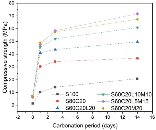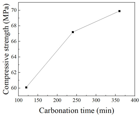 Due to the positive correlation between the carbonation rate of steel slag and the compressive strength of steel slag blocks [74,75], characterizing the change in strength with increasing carbonation time can, to some extent, represent the effect of carbonation time on the carbonation of steel slag. In the accelerated carbonation experiment on BOF steel slag blocks conducted by Li et al. [75], results showed that the strength of the blocks increased dramatically by 6.2 MPa as the carbonation period increased from 2 h to 4 h. It was followed by a reduction in strength gain that increased by 2.7 MPa as the carbonation period increased from 4 h to 6 h (Figure 8). As the reaction proceeded, the growth rate of carbon sequestration in steel slag gradually decreased. Moreover, after a long period of time, the influence of carbon dioxide concentration on the carbon sequestration rate of steel slag almost became less pronounced, and even the carbon sequestration rate of steel slag at lower concentrations exceeded that at higher concentrations [75]. Zhang et al. [76] investigated the carbonation of steel slag-based mortar prepared from the mixture of steel slag powder mixed with mineral materials, including MgO, CaO and cement, and found that the compressive strength increased by increasing the carbonation time. The compressive strength of the mortar containing 60% steel slag, 20% Portland cement, 5% lime, and 15% magnesium oxide (S60C20L5M15 in Figure 9) was 47.4 MPa at 1-day carbonation, and it increased to 71.6 MPa when carbonated for 14 days.