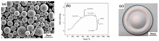 The inherent characteristics of the feedstock are shown in Figure 1, which reveals the appearance and the differential scanning calorimetry (DSC) curve of the powder. The atomized powder used in this work (Figure 1a) predominantly comprised smooth and round particles without a dendritic structure after solidification. As shown in Figure 1b, the DSC curve of the feedstock powder revealed a glass transition temperature (Tg) of about 555 °C, a peak crystallization temperature (Tp) of 659 °C, solidus temperature (TS) of 1111 °C, and a liquidus temperature (TL) of 1168 °C. The solidus temperature of the powder was below 1120 °C. To be used as the target for sputtering, the feedstock powders were pre-vacuumed and hot-pressed at 1080 °C, then the compact powders were sintered for 8 hours into a plate of a 6.0 mm thickness. A 75 mm diameter disc was wire-cut from the sintered plate to be the target for R. F. sputtering (Figure 1c).