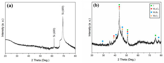 Figure 2 displays the XRD spectra of the sputtered film and the target. To avoid the interference of the sub-surface layer with the XRD spectrum, the film was deposited directly on the Si wafer. The XRD pattern of the film showed wide and broad peaks in the spectrum (Figure 2a), which indicated the very highly amorphous constituent of the film. By contrast, the XRD pattern of the target (Figure 2b) comprised many sharp peaks, which were identified to be attributed to complicated carbides, borides, and intermetallics formed in the target owing to the slow cooling of the sintered target after hot-pressing the feedstock powders. Although the target was crystalline, the film prepared by R. F. magnetron sputtering was amorphous. Metallic glass films can be fabricated by controlling the sputtering parameters, such as the power and working pressure, so that the as-deposited films inherit the composition and amorphous structure of the target.