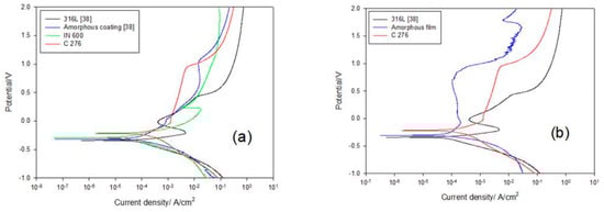 The potentiodynamic polarization curves of the (a) IN 600 and C276 alloys in comparison with the 316L and amorphous coating and (b) the C276 and amorphous film in comparison with 316L tested in 1 M HCl solution.