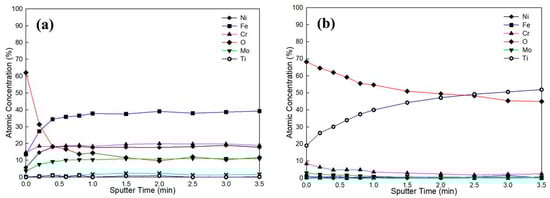 As displayed in Figure 6 and Table 2, the XPS depth profile (d) was achieved using an Ar+ ion beam accelerated at 3 keV and a sputtering area of approximately 2 × 2 mm2, and the binding energies of the elements, e.g., Fe, Ni, Cr, Mo, Si, Ti, and O, were measured. The etching rate of the film was about 8.16 nm/min for SiO2. The charging effect was amended using the C1s peak at 284.6 eV as the baseline for the investigated species []. In addition, all the peaks were distinguished based on the NIST database and the results reported in the available literature []. As shown in Figure 6a, the O content decreased from 60 at.% to 11 at.% as the depth increased from the surface to the depth after about 1.5 min of sputtering, when the low O content was detected after sputtering. However, after the film was attacked in the 1 M HCl solution, the contents of elements like Fe, Cr, Mo, and Si showed less change, but the Ti content increased with increasing sputtering time. At the depth corresponding to a sputtering time of 3.5 min (Figure 6b), the amorphous film was totally demolished.