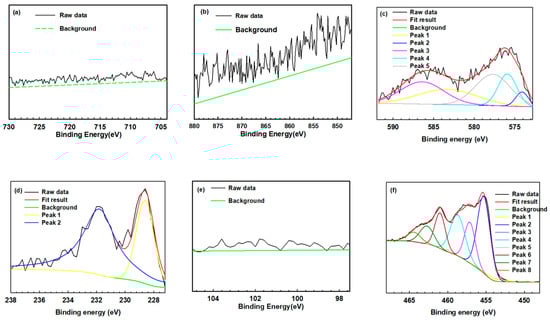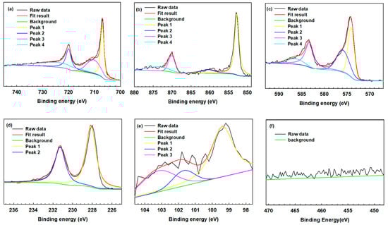 The deconvolution curve-fitting analyses of the binding-energy peaks of the (a) Fe, (b) Ni, (c) Cr, (d) Mo, (e) Si, and (f) Ti elements in the measured XPS spectra of the amorphous film.