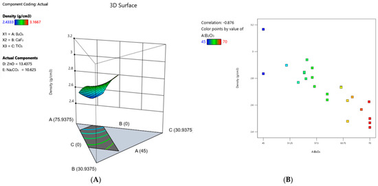 (A) 3D surface plot representing the density response across the compositional ranges of each constituent in the series. (B) Correlation graph of density vs. B2O3 content.