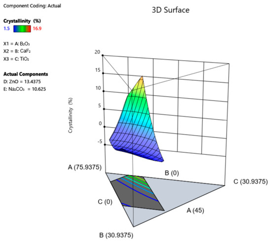 3D surface plot representing the % crystallinity response across the compositional ranges of each constituent in the series.