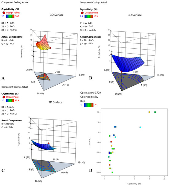 3D surface plots representing the % crystallinity response for three distinct scenarios in which the concentrations of CaF2 and TiO2 vary but the other components remain constant ((A) Minimum CaF2 and maximum TiO2; (B) maximum CaF2 and maximum TiO2; (C) maximum CaF2 and minimum TiO2). (D) Correlation graph of crystallinity vs. TiO2-CaF2.