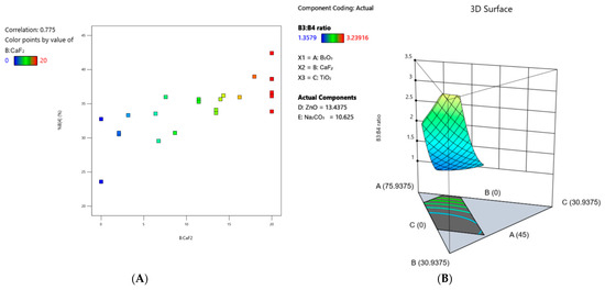 Lastly, analysis of the B3:B4 ratio (Figure 5B) produced a statistically significant quadratic model (Table 5), with values ranging from 1.358 to 3.24 (Table 4). The factors that contributed to an increase in B3:B4, ranked in order of magnitude, are TiO2 > B2O3 > ZnO > CaF2 > CaF2*Na2CO3 > ZnO*Na2CO3 > Na2CO3. The factors that contributed to a decrease in B3:B4, ranked in order of magnitude, are CaF2*TiO2 > B2O3*CaF2 > TiO2*Na2CO3 > TiO2*ZnO > B2O3*Na2CO3 > B2O3*TiO2 > B2O3*ZnO > CaF2*ZnO.
