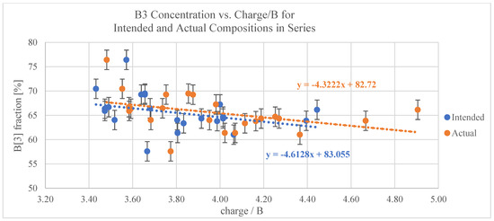 Fraction of B3 versus the overall cation charge per boron atom based on the intended composition of each glass (blue) and the actual, experimental composition of each glass (orange).