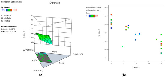 (A) 3D surface plot representing the Tg response across the compositional ranges of each constituent in the series. (B) Correlation graph of Tg vs. Na2CO3 content.
