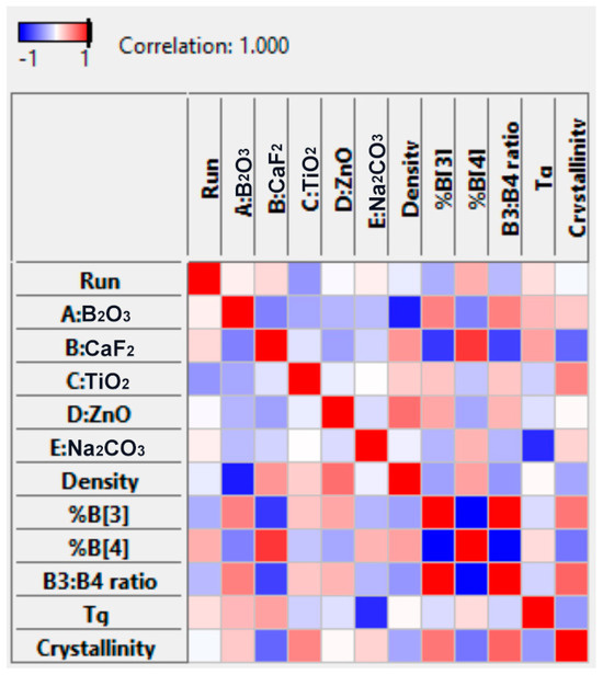 Correlation table indicating correlations that exist between glass constituents and responses. Correlations are represented on a color scale, wherein red indicates a positive correlation and blue indicates a negative correlation.