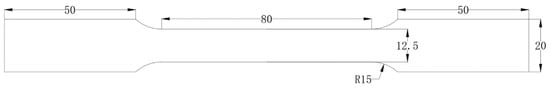 In this section, the mechanical properties of uniaxial tensile specimens made from the original sheet material were examined. Subsequently, the sheet material was pre-stretched at various pre-strain levels. Following pre-stretching, the specimens were subjected to heat treatment according to the orthogonal test table (as shown in Table 2). Finally, the specimens were pulled to fracture. The test was repeated three times for each condition. The uniaxial tensile tests were conducted on a 5982 universal testing machine manufactured by Instron, Boston, MA, USA. The dimensions and shape of the specimens are depicted in Figure 1.