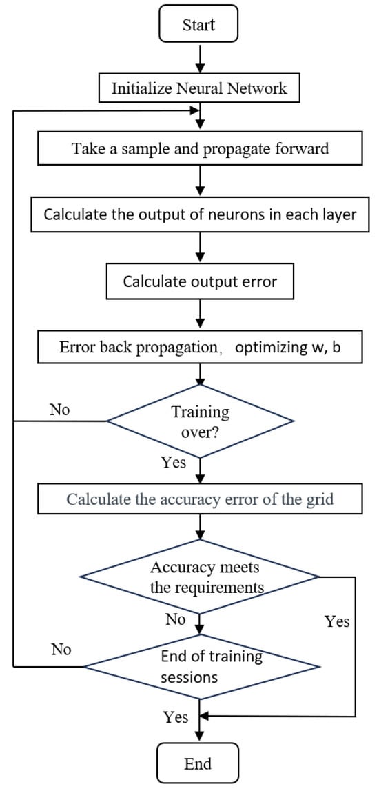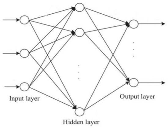 The BP neural network is a common neural network model used for solving classification and regression problems. The BP network can be employed to learn and store the mapping relationship of a large number of input–output models without the need to explicitly describe these mapping relationships using mathematical equations [12,13]. This model mainly consists of an input layer, an output layer, and hidden layers, as shown in Figure 3, where the inputs are connected to the outputs through neurons. The training process of the BP neural network consists of forward propagation and error backpropagation. During forward propagation, the input layer inputs the samples, and the hidden layer computes the output. When the output does not match the actual result, it leads to the generation of the mean square error, initiating the backward propagation phase. During backpropagation, the output error is calculated and propagated backwards through the hidden layers to the input layer, distributing the error among all units. The error signals of each layer’s units serve as the basis for adjusting the unit weights. The weights and bias parameters are then learned using gradient descent. The entire model flowchart of the neural network is shown in Figure 4. The specific processing steps of the model will be elaborated upon in the following text.