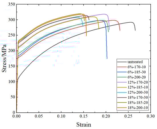 Figure 5 shows the stress–strain curves of AA6016 before and after pre-strain and heat treatment. From the stress–strain curves, it can be observed that pre-strain and heat treatment have a significant impact on the yield strength of AA6016. Both yield strength and tensile strength increased after pre-strain and heat treatment, while the elongation at break decreased.