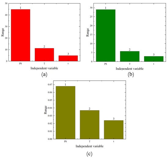The range analysis results are shown in Figure 7 (where the numbers on the bar charts represent the ranking). From these figures, it can be seen that among the three factors, the primary influencing factor is pre-strain, followed by heat treatment temperature and heat treatment time. Therefore, it is evident that both the analysis of variance and the range analysis results demonstrate that pre-strain has the greatest impact on the mechanical performance.