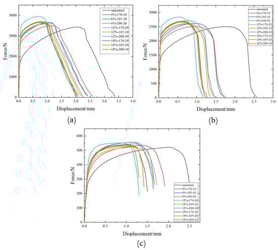 Comparison of tested and predicted values of force–displacement curves after pre-strain and heat treatment: (a) 6% pre-strain, (b) 12% pre-strain, (c) 18% pre-strain.