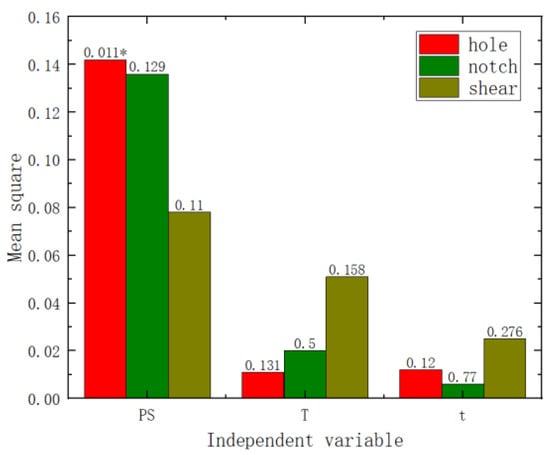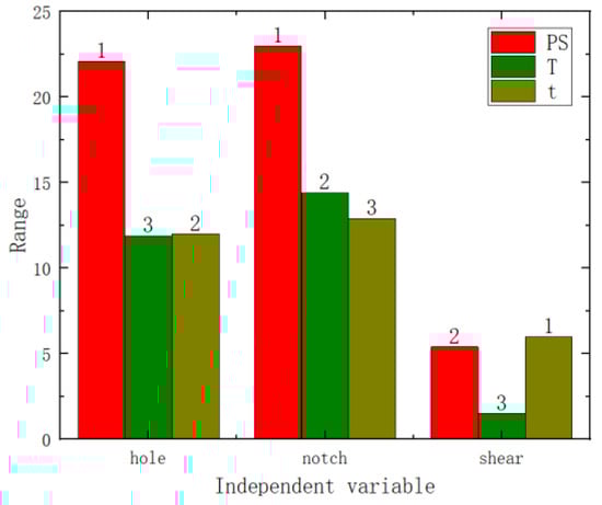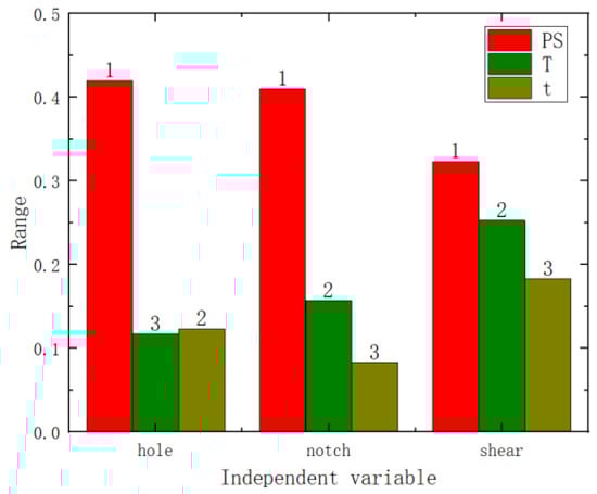 Variance and range analyses were conducted on the failure displacement and shear strength of the three specimen types with respect to pre-strain and heat treatment parameters. From the p-values in Figure 9 and Figure 10 (the numbers on the bar charts, with * indicating a p-value of less than 0.05), it can be observed that pre-strain significantly affected the failure displacement of the center hole specimen, the notched specimen, and the pure shear specimen. Heat treatment temperature did not exhibit a significant effect on the three types of fracture specimens. However, the heat treatment time showed a significant impact on the shear strength of the pure shear specimen. Range analyses results are shown in Figure 11 and Figure 12 (where the numbers on the bar charts represent the ranking). It can be observed that pre-strain significantly affects the shear strength and failure displacement of the three types of specimens. The influence of heat treatment temperature and time varies slightly for different specimens. In particular, for the pure shear specimen, its shear strength is notably influenced by heat treatment time, to the extent of slightly surpassing the impact of pre-strain. It can be seen that similar to the results of uniaxial tension, pre-strain predominantly influences the fracture performance of AA6016.