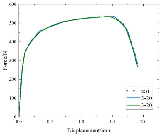 When establishing constitutive model and load–displacement curve prediction models using artificial neural network, it was found that R2 is very high in some cases, but the high level of dispersion of individual data prediction points results in a significant difference between the predicted curve and the experimental curve, as shown in Figure 16 (“2-20” represents two hidden layers with 20 neuron nodes, and so on in the following text). The R2 and RMSE of “2-20” are 0.9973 and 5.2004, while the R2 and RMSE of “3-20” are 0.9986 and 3.7765. It can be seen that the R2 of the two cases is similar, but RMSE of 3-20 is lower and the curve prediction is better. This suggests that RMSE is an important indicator in addition to R2.
