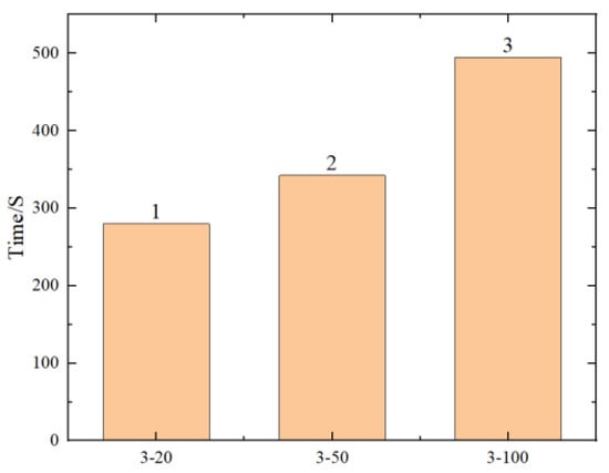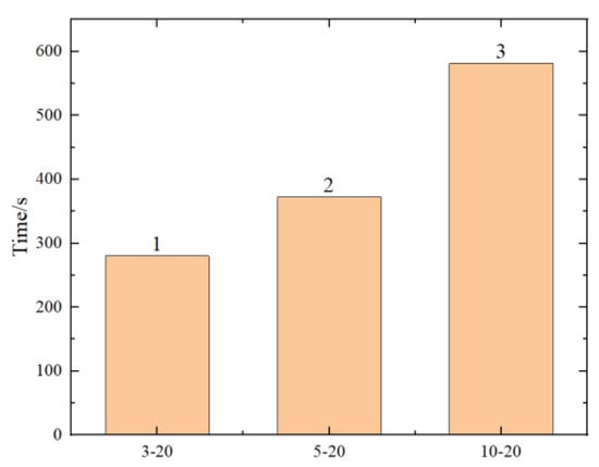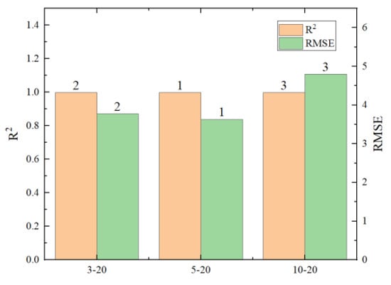 To explore the limits of the number of hidden layers and neuron nodes in neural networks, six different scenarios were designed, as shown in Table 5. R2, RMSE, and the running time of the predicted results are shown in Figure 17, Figure 18, Figure 19 and Figure 20 (where the numbers on the bar charts represent the ranking). Taking “3-20” on the x-axis in the figure as an example, “3” represents the number of hidden layers and “20” represents the number of neuron nodes. From the figures, it can be observed that when the number of neuron nodes is constant, increasing the number of hidden layers, as well as increasing the number of neuron nodes when the number of hidden layers is constant, does not significantly affect the accuracy of the prediction. The changes in R2 and RMSE are not substantial, but the prediction time of the model increases by approximately 1-fold. Evidently, an excessively high number of hidden layers and neuron nodes is not suitable.