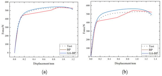 Comparison chart of prediction results between BP and GA-BP models: (a) 18%-185 °C-20 min; (b) 18%-200 °C-10 min.