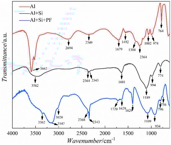 Infrared spectra of cured products of Al, Al+Si, and Al+Si+PF film formers.