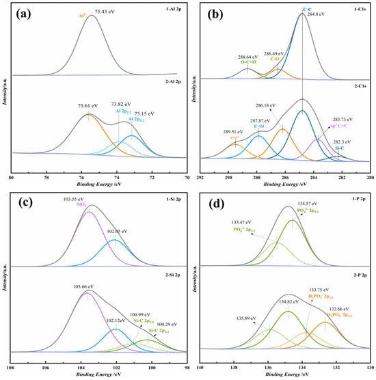 XPS analysis was performed to further verify whether the phenolic resin had been hybridized to the phosphate coating and to understand the impact of this hybridization on the surface structure of the coating, with the results presented in Figure 2. Sample 1 was a phosphate varnish without the hybridized phenolic resin, and Sample 2 was a phosphate coating hybridized with the phenolic resin. As depicted in Figure 2a, there was a discernible shift in the binding energy of carbon (C) following hybridization. The binding energy of the C-O bond shifts from 286.49 eV to 286.18 eV. Additionally, the spectrum after hybridization reveals the formation of new functional groups; the binding energy for the Si-C bond is 282.3 eV, alongside the appearance of sp2 hybridized C=C bonds and characteristic π-π* transitions of aromatic organic compounds, with their binding energies at 283.73 eV and 289.51 eV, respectively. Figure 2b demonstrates the shift in the binding energy of silicon (Si) after phenolic hybridization (from 103.55 eV to 103.66 eV) and the emergence of new chemical bonds Si-C in the 2p1/2 and Si-C 2p3/2 hybridized orbitals, with binding energies of 100.99 eV and 100.29 eV, respectively, indicating phenolic hybridization. Figure 2c,d show the binding energies for phosphorus (P) and aluminum (Al) elements, respectively. Compared to the non-hybridized phenolic resin, the hybridized P element exhibits the H2PO2− valence state, with the H2PO2− 2p1/2 and H2PO2− 2p3/2 binding energies at 135.89 eV and 134.82 eV, respectively. The binding energy of Al shifts from 75.43 eV to 75.61 eV after phenolic hybridization, introducing new orbitals Al 2p3/2 and Al 2p3/2, with binding energies of 73.15 eV and 73.82 eV, respectively. The XPS results provided surface information on the phosphate hybrid coating, i.e., the phenolic resin was fully hybridized to the phosphate system, thus suggesting that the surface after hybridization comprised the reaction products of the phenolic resin, SiO2, Al(H2PO4)3, and others.