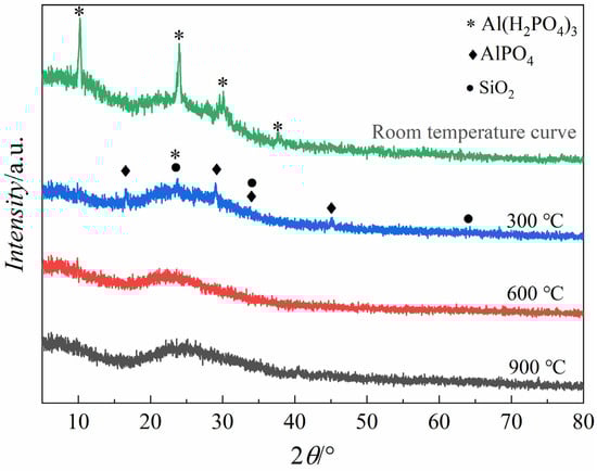 The X-ray diffraction (XRD) patterns of phosphate hybrid coatings that were cured at various temperatures: ambient conditions (room temperature), 300 °C, 600 °C, and 900 °C.