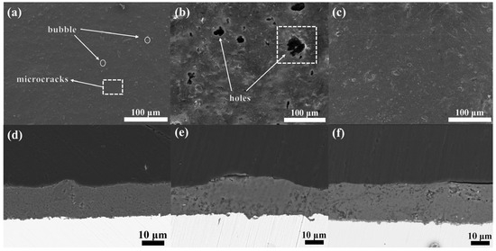 Surface and cross-sectional microstructure of phosphate coatings after high-temperature oxidation at 300 °C for 1 h, 10 h, and 100 h. (a,d) show the surface and cross-section of the coating after 1 h at high temperature; (b,e) show the surface and cross-section of the coating after 10 h at high temperature; (c,f) show the surface and cross-section of the coating after 100 h at high temperature.