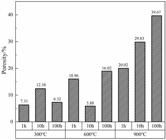 Odhiambo introduced a method for calculating the porosity of coatings: by analyzing the grayscale of images using a scanning electron microscope to calculate the porosity [24]. The porosity of coatings subjected to oxidative corrosion at 300 °C, 600 °C, and 900 °C for 1 h, 10 h, and 100 h was assessed. This analysis facilitated determining the optimal service time and temperature for the coatings under high-temperature conditions and identifying the conditions under which the phenol-formaldehyde resin exhibited the highest char yield. According to Figure 8, the coatings exposed to 300 °C and subjected to 100 h of oxidative corrosion exhibited the lowest porosity of 6.32%, suggesting that the highest carbonization rate of the phenol-formaldehyde resin occurs within this duration, while the significantly higher porosity observed after 10 h of exposure implies the predominant volatilization of the resin as carbon dioxide, consistent with the morphological characteristics analyzed using SEM.