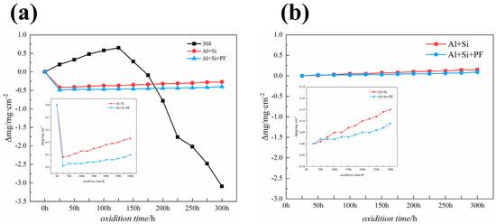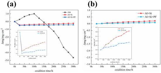 Dynamics curves of cyclic oxidation of Al+Si, Al+Si+PF, and 304 substrate at 600 °C for 300 h. (a) Cyclic oxidation kinetics curve from 0 to 300 h, and (b) cyclic oxidation kinetics curve from 25 to 300 h.