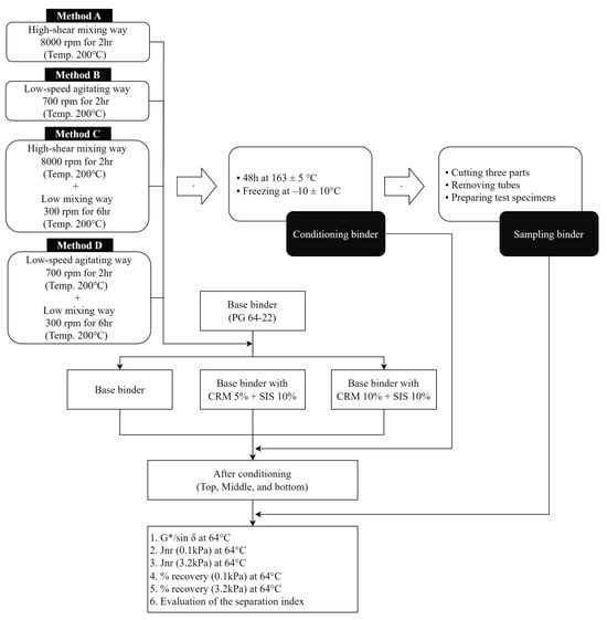 This study, as shown in the flow chart (Figure 1), is based on ASTM D7173 guidelines [39] and utilizes a dynamic shear rheometer (DSR) to examine the variations in storage stability results under the influence of five experimental factors. The modifiers employed include styrene–isoprene–styrene (SIS), known as styrene block copolymers, and a CRM. Four blending methods are introduced to assess how the storage stability is affected. Moreover, suggestions for future research plans and directions will be presented.