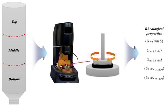 The multiple stress creep recovery (MSCR) test represents an advancement within the framework of the Superpave asphalt binder specification. One key benefit of the MSCR test lies in its ability to streamline the evaluation process by obviating the necessity for multiple distinct tests such as elastic recovery, toughness, ductility, etc., which are tailored to elucidate polymer deformation within asphalt binders. By consolidating these assessments into a single MSCR test, comprehensive insights into both the performance and composition of the asphalt binder can be gleaned. The methodology of the MSCR test draws upon established principles of creep and recovery testing to assess trends for permanent deformation in a binder. This involves subjecting the asphalt binder sample to a creep load lasting 1 s, followed by a recovery period of 9 s. Initially, a low stress of 0.1 kPa is applied for 10 creep/recovery cycles, which is subsequently augmented to 3.2 kPa for an additional 10 cycles. The MSCR test from traditional PG testing lies in its material response. While PG systems typically measure the high-temperature parameter G*/sin δ through the application of oscillatory loads at very low strain rates, the MSCR test employs higher stress and strain levels, thereby providing a more accurate depiction of pavement behavior. However, MSCR and PG systems are both widely utilized to assess asphalt binders. Therefore, both tests were considered in this research (Figure 5).