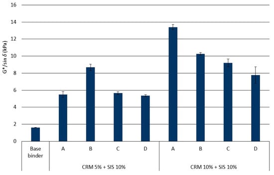 The rheological properties of the binder were assessed by evaluating G*/sin δ. Overall, the addition of the modifier resulted in an increase in G*/sin δ, showing that as the CRM content increased, there was a clear tendency for G*/sin δ to increase (Figure 6). This outcome is attributed to the CRM’s absorption of the light oil in the binder, leading to a relative increase in asphaltene content and gelling of the CRM. In the SIS binder with 5% CRM, the results obtained from Method B showed a slight increase, which is thought to be due to the uneven dispersion of SIS at high temperatures, resulting in the partial reaggregation of SIS. This result affected the binder using 10% CRM, which shows an uneven trend and the lowest resulting gap among each mixing method. In each mixing method for CRM 10% + SIS 10% asphalt binder, G*/sin δ was relatively lower in groups C and D, which utilize the low-speed mixing approach for 6 h, compared to groups A and B. This is attributed to the suboptimal performance of SIS, a styrene block copolymer, due to polymer molecular chain bond cracking induced by the prolonged reaction at high temperatures. Consequently, it is evident that there are significant differences depending on the modifying method and duration, underscoring the need to consider various conditions to ensure optimal performance under field conditions (e.g., rpm for the modification, temperature, etc.).