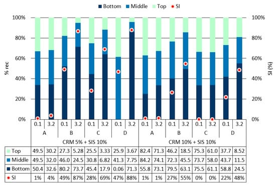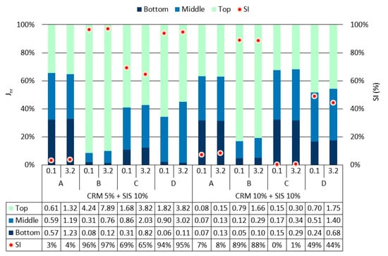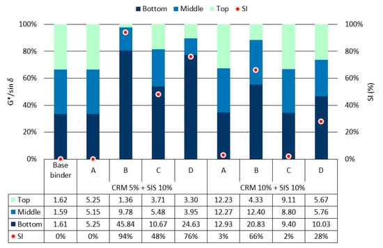 The binder’s storage stability was assessed by calculating the SI utilizing the G*/sin δ value as a factor (Figure 9). In general, within the groups employing high-shear mixing methods (Groups A and C), there was a consistent distribution of G*/sin δ values from top to bottom, accompanied by a downward trend in SI values. It is considered that this phenomenon arises due to the uniform dispersion of the modifier facilitated by the high-shear mixer. Nevertheless, for the SIS binder employing 5% CRM in Method C, the SI was marginally higher than that of the SIS binder utilizing 10% CRM. This suggests that with prolonged modification time, the SIS binder that dispersed within the modified asphalt binder tends to re-agglomerate, potentially exerting a detrimental impact on asphalt binder performance, but in the result of the SIS binder using 10% CRM, a higher content of CRM hindered the reaggregation of SIS. On the other hand, the groups that chose the low-speed agitating method (B and D) showed high SI results. In the group utilizing Method B, it was observed that the G*/sin δ value exhibited a notably higher magnitude at the bottom. This is thought to occur due to the uneven dispersion of the SIS modifier at an elevated modifying temperature, leading to re-agglomeration and the subsequent settling of a higher concentration towards the bottom. Conversely, with the addition of a CRM up to 10%, certain SI values showed a tendency to decrease. This phenomenon is attributed to the increased CRM particles, which are considered to impede the entanglement of SIS at elevated temperatures. For Method D, the observed trend indicated lower SI values compared to Method B. This discrepancy can be attributed to the generally reduced G*/sin δ values resulting from prolonged modification at a high temperature, which induces degradation in the polymer molecular chain bonds of SIS. Consequently, it was observed that SIS, as a styrene block copolymer, exhibits significant sensitivity to both the modification method and temperature, meaning that it is imperative to identify the optimal modification conditions when employing it as a modifier.