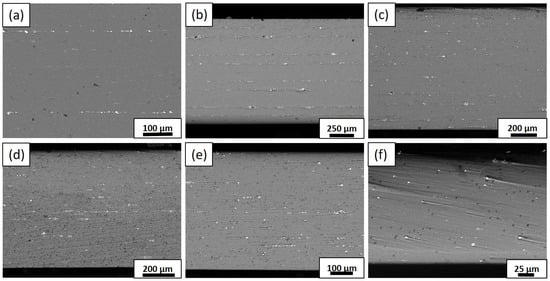 The experimental study utilized SEM to examine the microstructure of the Al/TiC MMCs during various rolling steps. Figure 3 depicts the SEM images of the Al/TiC composites. In Figure 3a, the TiC particle layers can be observed between the aluminum after ARB-1. The TiC particles initially aggregated in the early ARB stages, leading to the creation of TiC particle-free zones in all the samples. However, with increasing cycles, the TiC particle clustering decreased. The implementation of cryorolling after the ARBed process led to the transformation of the laminated shape composite, resulting in a uniformly distributed particle composite (Figure 3d) compared to the other cycles, although some unreinforced particles were also observed. Guo et al. [18] used SEM to characterize the microstructure and composition of silica–aluminum composite powders obtained through ball milling. Hullur et al. also [19] conducted a microstructural analysis of the AMCs reinforced with ceramic particles using SEM. They observed a uniform dispersion of the ceramic particles within the aluminum matrix, which significantly contributed to the material’s mechanical strength and deformation behavior. The materials were subjected to an XRD examination set at a rate of 0.45 min−1.