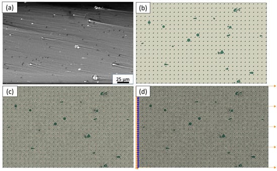 The generation of the finite element model is a crucial step in investigating the composite microstructures in terms of deformation evolution. To achieve this, the deliberate manipulation of the material’s microstructure is carried out, involving the incorporation of distinct regions representing the matrix and reinforcement particles. By extracting the X–Y coordinates of all the vertices, the segmented image is effectively transformed into the computational finite element domain. Figure 4 portrays the outcome of the segmentation process conducted using Abaqus, showcasing the computational domain established to mimic the real composite microstructure. As shown in Figure 4a, the SEM image of the actual composite microstructure serves as the reference for creating the segmented microstructure, as illustrated in Figure 4b. This segmented microstructure allows for the precise representation of the reinforcement particle and matrix regions within the model. In a study by Gao et al. [20], they utilized FEA and the Abaqus software to generate a segmented microstructure of AMCs reinforced with ceramic particles. In Figure 4c, the mesh used in the RVE−1 model is illustrated, comprising 18,117 nodes and 36,152 linear triangular elements of type CPS3. By analyzing the behavior of the material subjected to tension through the finite element analysis of the model, the critical mechanical characteristics, such as strength, deformation behavior, and stress distribution, can be accurately evaluated. The utilization of the finite element mesh with a substantial number of nodes and elements ensures a highly detailed and accurate representation of the material’s microstructure. This level of refinement allows for the precise examination of the stress concentrations, deformation patterns, and failure mechanisms within the composite material. The finite element model, as depicted in Figure 4d, was constructed with fixed constraints applied to the edges of the model, while an external tensile load was simulated by applying forces to pull the model in opposite directions. The fixed constraints on the edges of the RVE−1 model ensure that the boundaries remain immobile, reflecting a realistic scenario where the material is anchored or clamped during testing. The applied tensile load allows for the simulation of the composite material’s behavior under tension, providing crucial insights into its mechanical response. Through this advanced microstructural modeling and finite element analysis approach, the study aims to gain comprehensive insights into the mechanical characteristics of the matrix.