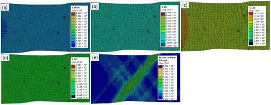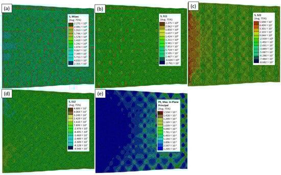 Simulation results for RVE−5 case: (a) σvm; (b) σxx; (c) σyy; (d) σxy; and (e) εmax distributions.