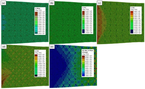Simulation results for RVE−2 case: (a) σvm; (b) σxx; (c) σyy; (d) σxy; and (e) εmax distributions.